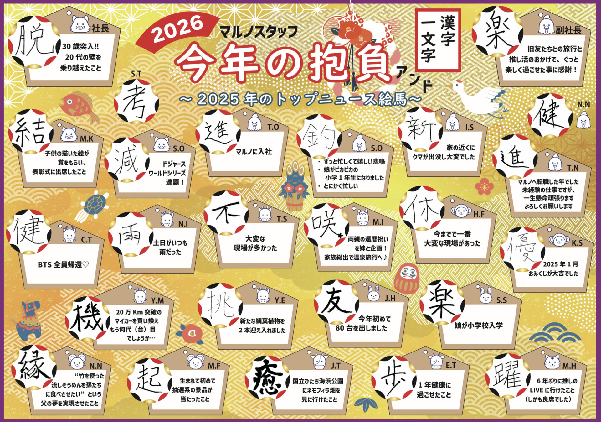 ・マルノスタッフ 2026年今年の抱負(漢字一文字)&2025年トップニュース(絵馬)